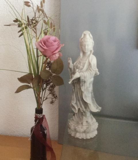 Tà tà rảo bước trên sân chùa Kim Sơn, một tu viện tọa lạc trên đỉnh núi cao thuộc thành phố San Jose, miền Bắc California, sau khi vào chánh điện đảnh lễ Phật, dì cháu loanh quanh vào cửa tiệm chùa, nơi phát hành đủ loại tôn tượng lớn, nhỏ các vị Phật và Bồ Tát. Nhi thỉnh được một tôn tượng Quán Thế Âm rất ưng ý. Tượng bằng đá màu xám nhạt, cao chừng hai gang tay, vừa vặn kích thước ban thờ Nhi mong đợi, điêu khắc rất tinh xảo, sắc nét. Trong cơn bão biển thập tử nhất sanh lúc vượt biên, Nhi đã từng khấn nguyện cầu bình an và phát nguyện qua cơn nguy khốn, Nhi sẽ thờ Ngài như một sự tri ân tưởng nhớ Ngài.